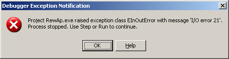 При запуске программы из Delphi в случае ошибки во время открытия файла возникает исключение, и на экране появляется диалоговое окно с сообщением.