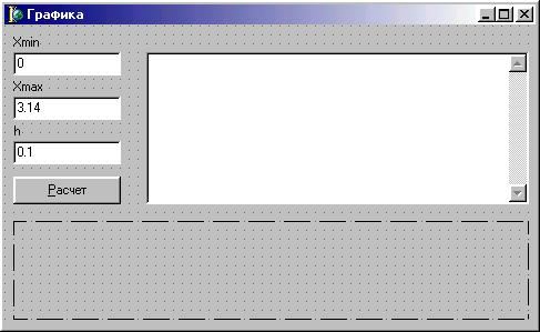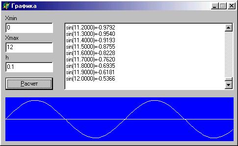 Остановимся на командах построения графика. Сначала мы заливаем весь холст синим цветом и проводим посередине горизонтальную белую линию – это ось ОХ. Затем необходимо рассчитать масштабные коэффициенты по осям координат, чтобы при любых значениях Xmin, Xmax и h график уместился в окне. Для функции sin(x) очевидно, что по оси OY ее значения будут изменяться от -1 до 1 (значение синуса достигает четырех только в военное время), а по оси ОХ – от Xmin до Xmax. Коэффициенты по осям будут равны:
