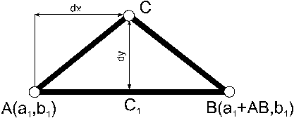 Рассмотрим задачу построения треугольника с известными длинами сторон AB, AC, BC. Подобное построение вызывает большие трудности, поскольку непонятно, с чего же начать? Сделаем следующее. Зафиксируем на холсте одну вершину треугольника в точке с произвольными координатами a1,b1. Будем считать, что одна из сторон идет горизонтально, что сразу дает нам координаты второй точки (Рис. 13).