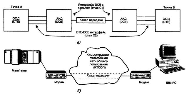 На Рис. 24, а DCE может являться аналоговым модемом, если используется аналоговый канал, или, например, устройством обслуживания канала/данных (CSU/DSU — Channel Seruis Unit/ Data Service Unit), если используется цифровой канал типа Е1/Т1 или ISDN. Модемы, разработанные в 60..70-х годах ХХ века, представляли собой устройства исключительно с функциями преобразования сигналов. Однако в последние годы модемы приобрели значительное количество сложных функций, которые будут рассмотрены ниже.