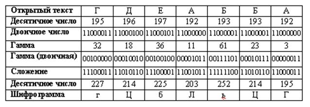 В компьютерах преобразование открытого текста происходит естественным путем, так как каждый символ кодируется двоичным числом. Вид этого преобразования зависит от используемой операционной системы. Для определенности будем считать, что открытое сообщение кодируется с помощью кодовой таблицы CP1251 (операционная система Windows). Кроме того, будем считать, что секретная гамма добавляется к открытому тексту по правилу сложения по модулю два без переносов в старшие разряды (логическая операция Исключающее ИЛИ). Результаты всех преобразований поместим в таблицу.