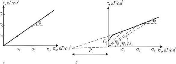 Сопротивление сдвигу песчаных пород зависит от трения (рис а), глинистых– от трения и сцепления (рис. б).