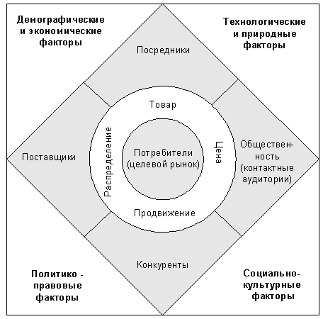 Маркетинговая среда - совокупность активных субъектов и сил, действующих за пределами фирмы и влияющих на ее возможности устанавливать и поддерживать отношения успешного сотрудничества с целевыми клиентами. Маркетинговая среда состоит из микросреды и макросреды.