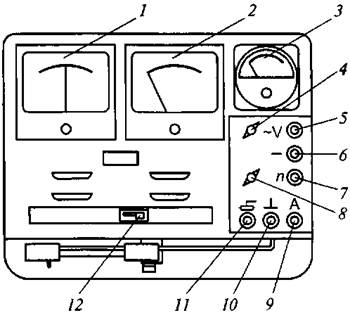 1 — амперметр; 2 — вольтметр; 3 — тахометр; 4 — рукоятка переключателя вольтметра; 5 — клемма подключения вольтметра; 6 — клемма подключения вольтметра и тахометра; 7 — клемма подключения тахометра; 8 — рукоятка переключателя амперметра; 9 — клемма «А» подключения амперметра; 10 — клемма подключения массы проверяемого трактора; 11 — клемма подключения реостата; 12 — рукоятка нагрузочного реостата