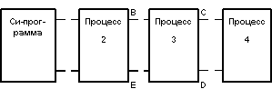 Процессы связаны программными каналами (pipes) ОС UNIX. Прямая информация при обработке операторов передается по каналам A, B и C. Результаты, включая сообщения об ошибках, передаются по обратным каналам D, E и F. Процессы работают строго синхронно: после посылки прямого сообщения каждый процесс дожидается получения ответного сообщения, а после посылки ответного сообщения - ждет получения очередного прямого.