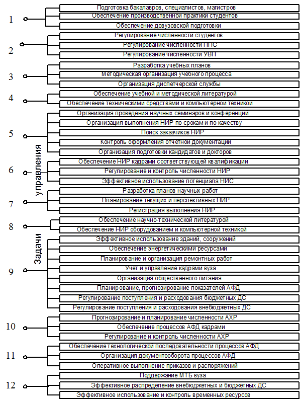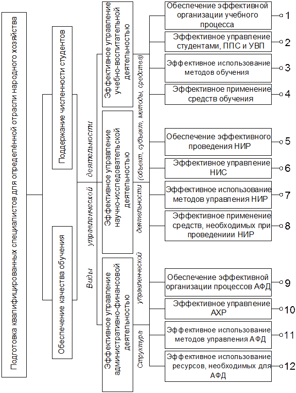 Деятельность любого крупного современного университета, института или академии с точки зрения автоматизации управления может рассматриваться как функционирование производственного предприятия, которое обладает сложной структурой управления, территориально разнесено на достаточно большой территории и выпускает специфический товар – квалифицированных специалистов. Вместе с тем организация системы управления вузом имеет свои особенности. Так, в качестве отличительной особенности вуза можно выделить относительно строгое деление его деятельности на три направления: учебно-воспитательная работа, включающая в себя подготовку бакалавров, специалистов и магистров; научно-исследовательская работа, состоящая в подготовке научно-педагогических кадров и выполнении фундаментальных и прикладных научных исследований; административно-финансовая деятельность (АФД), ориентированная на создание и поддержание материально-технической базы учебного и научного процессов. Следует отметить, что каждое из перечисленных направлений имеет свой комплекс проблем, отличных от проблем промышленного или торгового предприятия. Очевидно, что качество управления вузом в целом зависит от эффективности управления его видами деятельности, которые функционируют для достижения одной общей цели - подготовка квалифицированных специалистов для определенной отрасли народного хозяйства. Из дерева целей вуза, представленного на рис.1.6, видно, что определяющими с точки зрения достижения глобальной цели являются учебно-воспитательная и научно-исследовательская части вуза, а административно-финансовой отводится роль сопровождающей, обеспечивающей сферы, которая вместе с тем имеет значительное влияние на результаты деятельности вуза в целом. Кроме того, она имеет сложную организационную структуру (рис. 1.7), основными управляющими