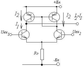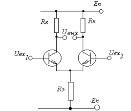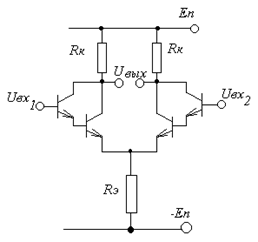 На рис. представлена схема, состоящая из двух по возможности одинаковых транзисторов, двух коллекторных резисторов, тоже одинаковых, и одного эмиттерного резистора, общего для двух транзисторов. Схема имеет два входа и один разностный выход. Здесь также обычно используется два источника питания.