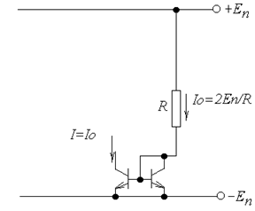 Здесь использованы два одинаковых транзистора (лучше изготовленных в одном цикле), и через правый, включённый по схеме диода (коллекторный р-п переход закорочен, и остаётся только эмиттерный р-п переход) пропускается прямой ток. Этот ток определяется формулой: