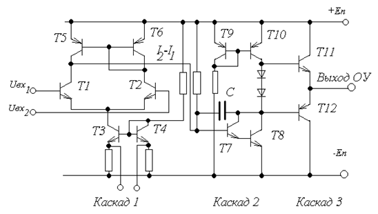 Обычно частотная характеристика таких каскадов очень хорошая, поэтому для ОУ она не вносит ничего отрицательного. Схема этого каскада изображена на рис.: