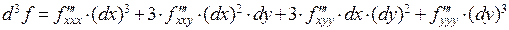 В последней формуле мы воспользовались свойством равенства смешенных производных. Нетрудно видеть, что формула дифференциала второго порядка аналогична формуле второй степени суммы трех слагаемых. Нетрудно сосчитать дифференциалы второго и третьего порядков функции двух переменных