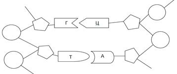«Алфавит», с помощью которого записана эта информация ДНК, включает четыре «буквы» - основания аденин /А/, гуанин /Г/, тимин /Т/ и цитозин /Ц/. В м-РНК тимин заменен урацилом /У/.