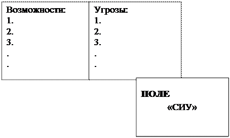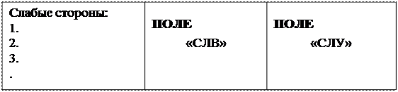 На пересечении разделов образуется четыре поля: поле «СИВ» (силы и возможности); поле «СИУ» (сила и угрозы); поле «СЛВ» (слабость и возможности); поле «СЛУ» (слабость и угрозы).