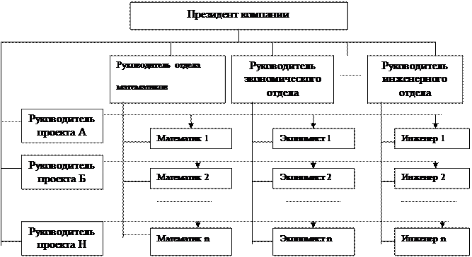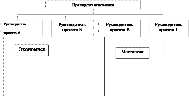 Ø Проектная – временная структура, создаваемая для решения конкретной задачи. Смысл: собрать в одну команду квалифицированных сотрудников организации для осуществления сложного проекта в установленные сроки, не выходя за пределы, установленные сметой. Проектные структуры управления могут возникать при проведении научных исследований и конструкторских разработок сложных изделий, когда на создание самого проекта необходимо затратить немало средств и времени, привлекая высококвалифицированных специалистов разных специальностей. Это требует введения такой должности, как руководитель проекта с подчинением ему всех работников, участвующих в проекте, и всех необходимых для этого финансовых и материальных ресурсов. Когда проект завершен – команда распускается.