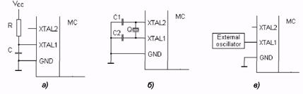 Простейшим и наиболее дешевым считается внутренний (реализованный на кристалле) RC-генератор. Он строится без внешних компонентов, но на частоту колебаний такого генератора влияет напряжение питания и температура. Для повышения стабильности к схеме внутреннего тактового генератора подсоединяются внешние высокостабильные времязадающие компоненты: кварцевые или керамические резонаторы. В ряде случаев микроконтроллеры используются с внешними схемами тактовых генераторов. Это также обеспечивает высокую точность отсчета времени и, при необходимости, позволяет синхронизировать работу сразу нескольких устройств. Некоторые схемы, могут работать с различными генераторами.