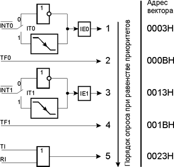 Из пяти источников прерываний внешними являются входы INT0# и INT1#, а внутренними - два счетчика/таймера и последовательный порт. Активные сигналы на входах INT0#, INT1# устанавливают флаги IE0, IE1 регистра TCON. Таймер 0 и Таймер 1 используют для выработки запросов прерываний флаги переполнения TF0, TF1 в регистре управления TCON, а последовательный порт использует для этого два флага - приемника RI и передатчика TI в регистре управления SCON. Каждый из флагов последовательного порта может вызвать прерывание, а конкретный источник определяет процедура обслуживания посредством опроса.