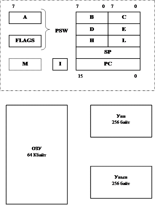 Программная модель 8-разрядного микропроцессора (МП) i8080 (К580ВМ80) включает в себя (Рис. 2.1) программно-доступные объекты МПС, т.е. те объекты, состояние которых можно проанализировать и/или изменить при помощи команд МП. К таким объектам относятся внутренние регистры МП, ячейки памяти и порты ввода/вывода.