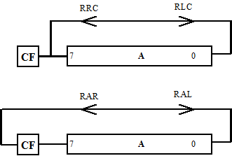 В системе команд i8080 имеются 4 команды циклических сдвигов аккумулятора, особенности которых иллюстрируются Рис. 2.2.