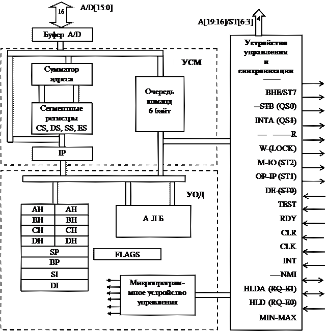 УСМ обеспечивает формирование 20-разрядного физического адреса памяти и 16-разрядного адреса ВУ, выбор команд из памяти, обмен данными с ЗУ, ВУ, другими процессорами по магистрали. УСМ включает в себя сумматор адреса, блок регистров очереди команд и блок сегментных регистров.
