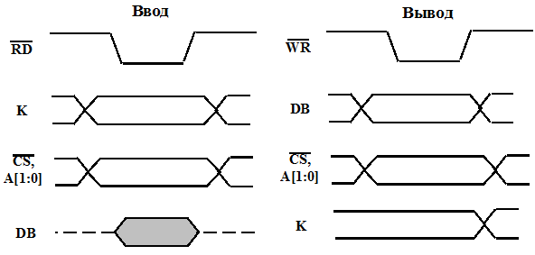 Режим "0". При работе в этом режиме на вывод информация, поступающая с системной шины DB, запоминается в буферном регистре канала, адресуемого A[1:0] и сразу же передается на его выход. При вводе информации данные с линий соответствующего канала, минуя регистр, поступают через буфер данных на системную шину данных DB. Временные диаграммы режима "0" приведены на Рис. 6.6, где под именем K понимается один из трех каналов: A, B или C.