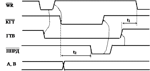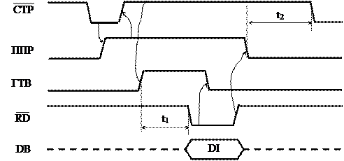 При появлении сигнала RD\ по соответствующему адресу содержимое регистра канала передается на шину данных DB и далее - в МП. По спаду RD\ снимается запрос ГТВ, а по фронту RD\ снимается ППР и ВУ получает возможность формировать новый строб записи данных. Промежуток времени t2 характеризует быстродействие ВУ и может, как и t1, иметь произвольную длительность.