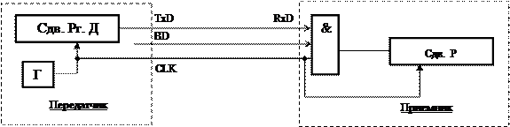 При синхронном методе передатчик генерирует две последовательности - информационную TxD и синхроимпульсы CLK, которые передаются на приемник по разным линиям (Рис. 6.9).
