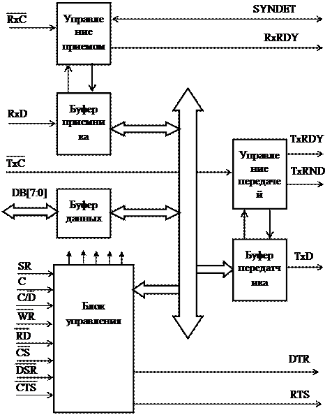 Если при приеме обнаруживаются ошибки четности или длительности стоп-бита, то соответствующие триггеры ошибок устанавливаются в единичное состояние. Принятые данные передаются через внутренние шины в выходной регистр данных, и на выходе RxRDY устанавливается высокий уровень. Если предыдущий символ еще не считан процессором, то он теряется, и устанавливается триггер ошибки переполнения.