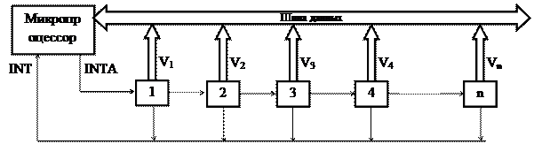 (3) Для исключения конфликтов при одновременном возникновении нескольких запросов на векторном входе ответный сигнал INTA подается на источники запросов не параллельно, а последовательно – в порядке убывания приоритетов запросов. Источник, не выставлявший запроса, транслирует сигнал INTA со своего входа на выход, а источник, выставивший запрос, блокирует дальнейшее распространение сигнала INTA. Таким образом, только один источник, выставивший запрос, получит от процессора сигнал INTA и выдаст по нему свой вектор на шину данных.