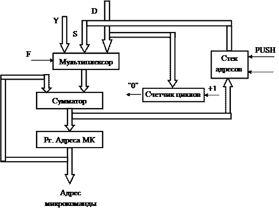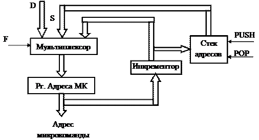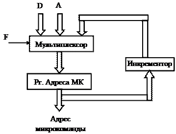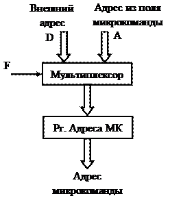 Начальный адрес микропрограммы (D) задается извне, а специальное поле МК (F) определяет источник адреса.