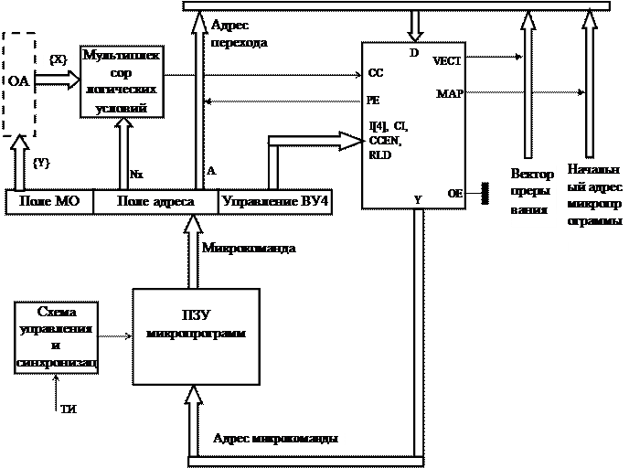 Устройства управления, реализованное на базе БИС К1804ВУ4 (Рис. 10.10) включает в себя ПЗУ микропрограмм, регистр микрокоманд, мультиплексор логических условий и схему управления. Формат микрокоманды содержит поля микроопераций, инструкций, адресов и т.п. для управления операционным автоматом ОА, поля для формирования адреса перехода (адрес и номер проверяемого логического условия) и поля управления собственно..ВУ4.