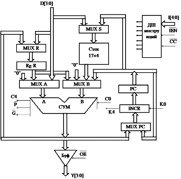 | C0, C4 | Вход и выход переноса сумматора | FL\ | Стек полон (при FL = 0) |