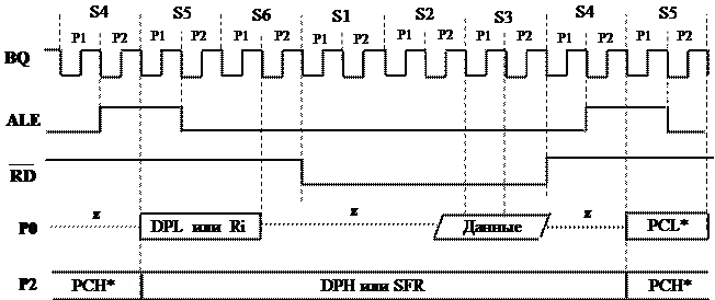 Обращение к внешней памяти данных XSEG по команде MOVX требует второго МЦ, в котором не вырабатывается первый строб ALE. На Рис. 11.14 приведена временная диаграмма обращения к XSEG (чтение). Запись в XSEG осуществляется аналогично, кроме того, что вместо сигнала RD формируется WR и на P0 после снятия младшего байта адреса устанавливаются выходные данные (содержимое аккумулятора).