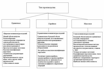 2. В зависимости от номенклатуры, регулярности, стабильности и объема выпуска изделий современное производство подразделяется на различные типы – единичное, серийное, массовое, рис.1.