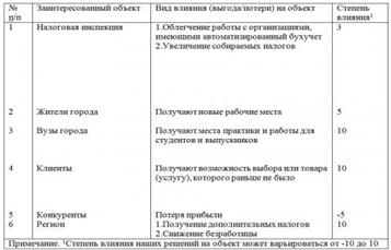 Для оценки влияния решения наших проблем на другие заинтересованные объекты можно построить матрицу проблематики, включающую перечень заинтересованных объектов, вид (выгода или потеря) и степень влияния на них наших решений, их поддержку или противодействие.