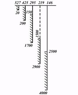 На рис. 1.1, а представлен профиль скважины, а на рис. 1.1, б графически изображена рабочая схема ее конструкции. Вверху над каждым рядом обсадных колонн пишется диаметр (в мм), а внизу - глубина установки (в м), интервал подъема цементного раствора обозначается штрихами, выше которых отмечается высота его подъема; иногда приводится номер долота.