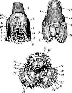 Широкий проходной канал, ограниченный внутренними стенками головки 1, принято называть внутренней полостью 14 долота, а заплечики 15 - упорным уступом (торцом), который обычно имеет скошенную фаску.