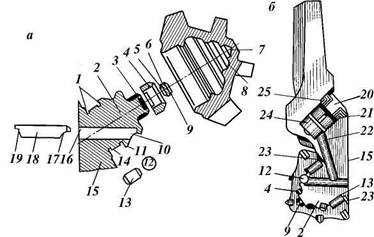 а - элементы опоры шарошки; б- секция долота с герметизированной опорой.