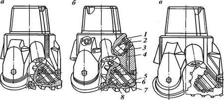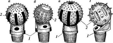Долота серии 1 (см. рис.8.5,а) предназначаются преимущественно для среднеоборотного вращательного способа бурения. Их применяют при роторном бурении с винтовым или другим забойным двигателем, вращающим долото с относительно невысокой частотой вращения (до 350 об/мин).