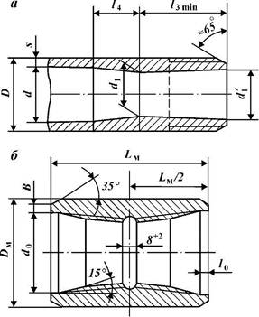 а -конец трубы типа 3 с высаженными внутрь концами и коническими стабилизирующими поясками; б - конец трубы типа 4 с высаженными наружу концами и коническими стабилизирующими поясками