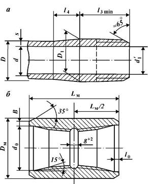 Рис. 11.7. Трубы типа 1 с высаженными внутрь концами и муфты к ним: а - труба; б - муфта