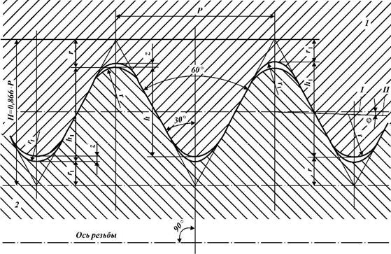1 - муфта; 2 - труба; I - линия, параллельная оси резьбы; II - линия среднего диаметра резьбы