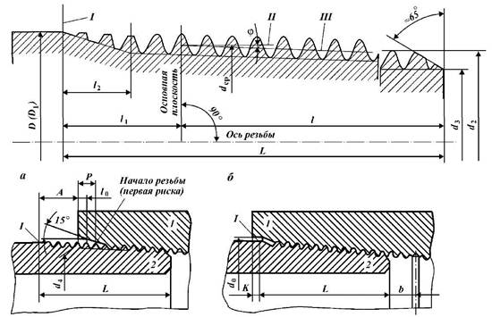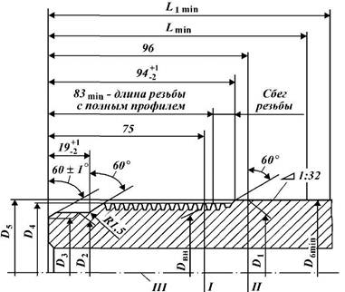 Рис. 11.13. Резьбовое соединение бурильных труб типов 3, 4: I - основная плоскость; II - расчетная плоскость конического стабилизирующего пояска; III - ось резьбы