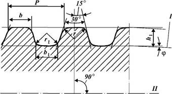 Рис. 11.12. Профиль трапецеидальной резьбы труб типов 3, 4: I - линия, параллельная оси резьбы трубы; II - ось резьбы трубы