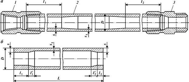 а- сборной конструкции; б - труба с внутренними утолщениями; 1 - муфта; 2 - труба; 3 - ниппель