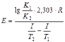 Энергию активации Е рассчитывают по двум константам скорости К1 и К2 (К1>K2), определенным при двух различных температурах T1 и T2 (T1>T2) из уравнения: