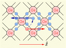 При повышении температуры полупроводника (при освещении или облучении электромагнитным полем) электроны могут получить энергию, достаточную для разрыва ковалентных связей. Тогда в кристалле возникнут свободные электроны, и он будет проводить электрический ток. Одновременно в местах разрыва связей образуются вакансии, которые не заняты электронами. Эти вакансии получили название «дырок». При заданной температуре в единицу времени образуется определенное количество электронно-дырочных пар. В то же время идет обратный процесс – при встрече свободного электрона с дыркой, восстанавливается электронная связь между атомами германия. Этот процесс называется рекомбинацией (восстановление связей).