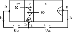 подается «-» к n-слою, а «+» к p-слою. Коллекторный переход также открыт, поэтому напряжение