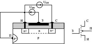 Структура полевого транзистора и его условное обозначение показаны на рис. 3.1. Транзистор состоит из двух областей. Область полупроводника между истоком (И) и стоком (С) называется каналом. В данном случае канал имеет n-тип. Другая область полупроводника имеет повышенную концентрацию примеси и называется затвором (З). В данном случае затвор имеет p-тип. Затвор и канал отделены друг от друга p-n-переходом. Знаком