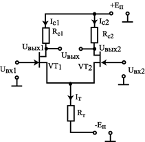 Полевые транзисторы обладают большим входным сопротивлением, поэтому, если требуется большое входное сопротивление, то балансные каскады строятся на полевых транзисторах. Схема каскада на полевых транзисторах показана на рис. 16.2. Транзисторы VT1 и VT2 и сопротивления
