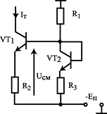 уменьшается, то напряжение в коллекторе VT2 возрастает, т.е. увеличивается напряжение в базе VT1. Тогда напряжение между базой и эмиттером транзистора VT1 остается постоянным и ток коллектора не меняется.