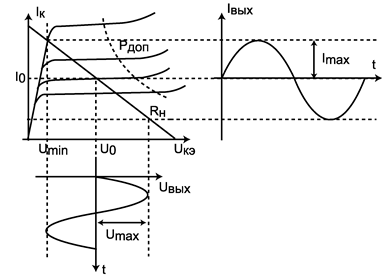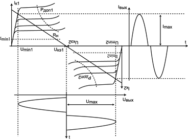На рис. 17.2 показаны временные диаграммы выходных напряжений и токов каскада. Рабочая точка (U0,I0) на нагрузочной прямой